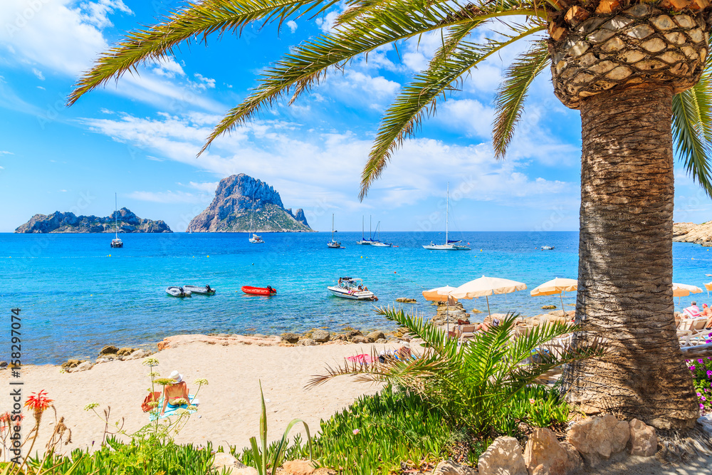 View of idyllic beach of Cala d'Hort wih palm tree in foreground, Ibiza island, Spain