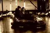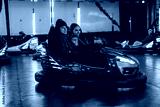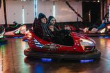 Group of friends riding bumper cars during a winter holiday outing, having fun, and laughing. The festive atmosphere captured with vibrant lights and joyful expressions creates an enjoyable experience