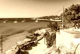 View of coastal promenade along beach in Cala Portinatx, Ibiza island, Spain
