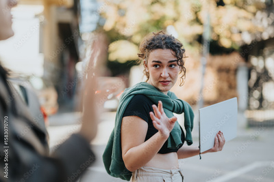 A woman in casual attire gestures expressively while on a street in a vibrant urban setting. She holds a notebook and is engaged in an intuitive or thoughtful interaction with another person.