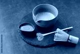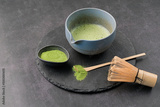 Traditional green matcha kit, Bamboo whisk and beverage on slate plate , dark background with copy space