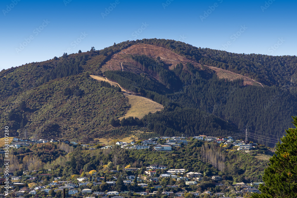 Nelson, New Zealand. Jenkins Hill above Enner Glynn and Stoke. Steep hiking area in Grampians Reserve, Barnicoat Range. Mix of plantation forestry and original native beech forest.