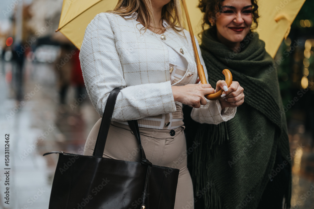 Two friends standing together under a yellow umbrella in a city setting, enjoying their time despite rainy weather, radiating warmth and companionship amidst urban surroundings.
