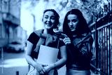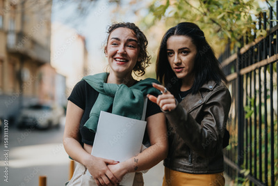 Two young women stand outdoors, smiling and interacting, showcasing a moment of connection and happiness.