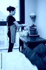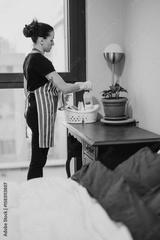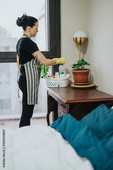 A housekeeper cleaning a bedside table in a well-lit bedroom with cleaning supplies at hand, reflecting tidiness and care.