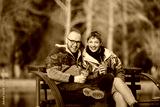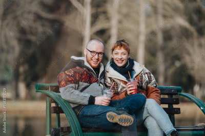 A cheerful couple sitting on a park bench holding drinks, enjoying a bright day out. Their happiness reflects in their friendly expressions amid an outdoor scenic atmosphere.