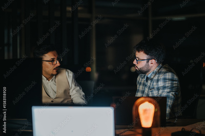 Two diverse colleagues engage in an intense brainstorming session late at night, focused on deadlines and strategic planning.
