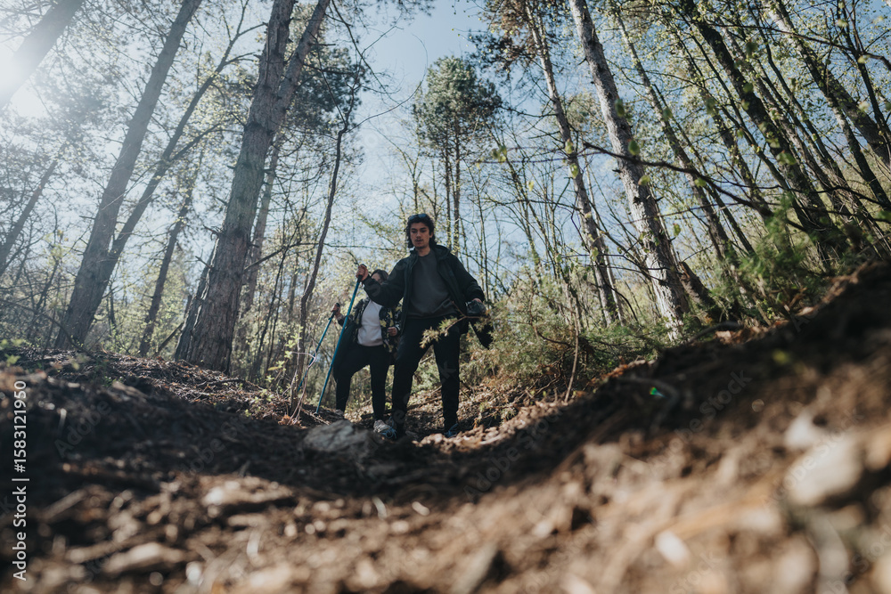 A couple enjoying a hike together in a forested area, surrounded by tall trees and sunlight filtering through the leaves, depicting outdoor activity and connection with nature.