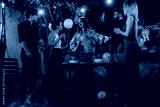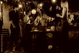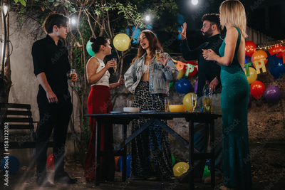 Friends gathered outdoors at night celebrating with drinks and colorful decor. The festive atmosphere includes party lights, balloons, and a table filled with drinks, embodying a cheerful mood.