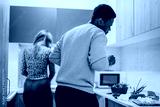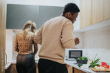 A couple enjoys cooking in a bright, modern kitchen. Their teamwork and diversity are showcased, offering a warm portrayal of everyday life at home.