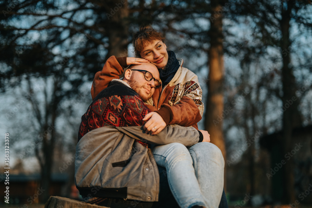 A couple shares a warm embrace while enjoying a serene moment in nature during fall. The scene exudes affection, tranquility, and connection beneath the backdrop of scenic trees.
