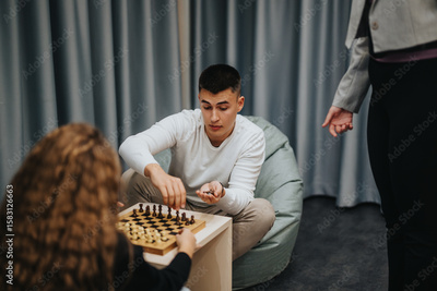 A group of high school students engage in a chess game, fostering strategic thinking and relaxation. The setting is casual, emphasizing leisure and social interaction among teenagers.