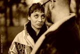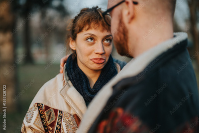 A couple sharing a humorous and endearing interaction outdoors, highlighting affection and connection.