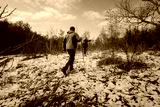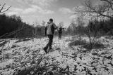 Two hikers traverse a snow-dusted terrain among trees and shrubs under a clear sky, showcasing outdoor adventure and exploration during winter.