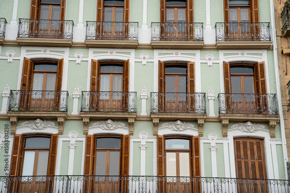Elegant architectural details of historic building in Pamplona, Navarra, Spain showcasing intricate balconies and window designs