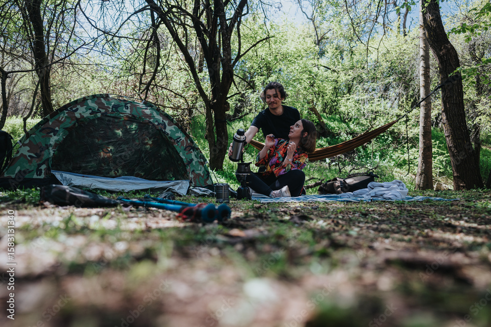 A serene scene of a couple camping, sharing a moment amid nature near a hammock and tent, under a canopy of trees.