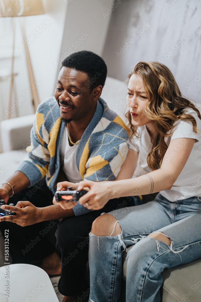 A cheerful diverse couple playing video games on a couch, enjoying their time together in a cozy home setting, showcasing friendship, gaming, and a relaxed domestic environment.