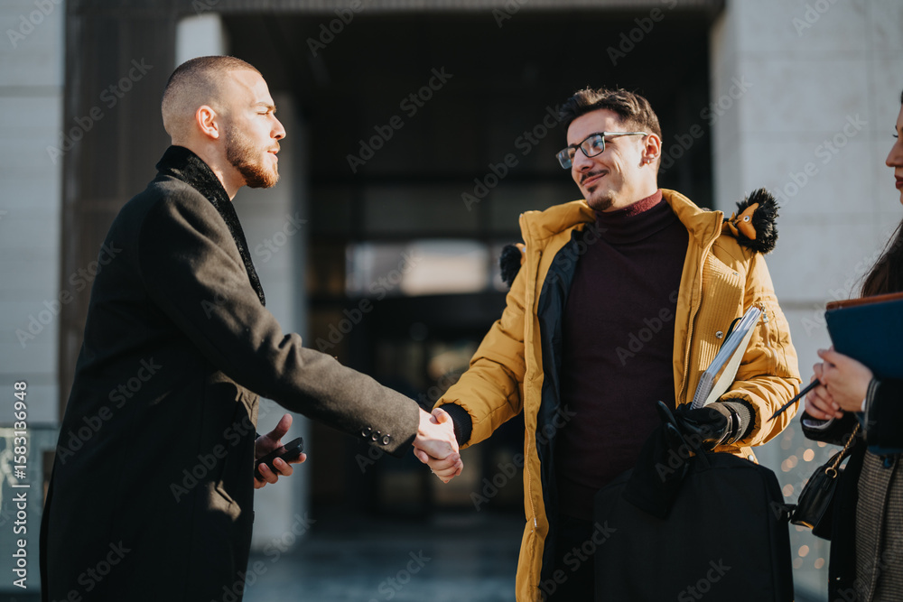 Two individuals shake hands outdoors, showcasing teamwork and collaboration in a professional context, with a modern urban background.