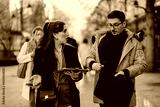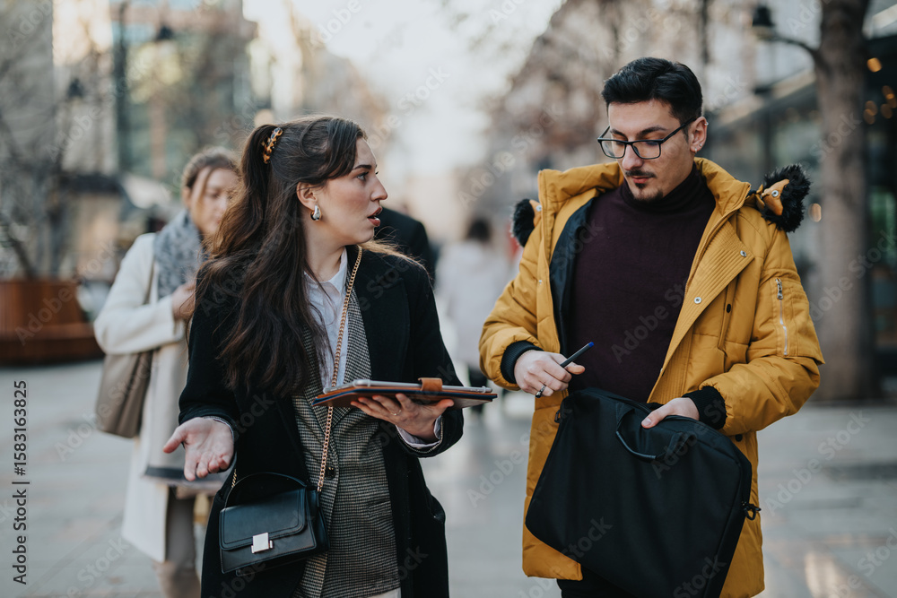 Two business professionals engaged in an animated discussion while walking along a city street, showcasing collaboration and teamwork.