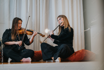 Two women musicians are sitting indoors, playing violin and flute together, creating a warm and peaceful ambiance.