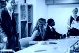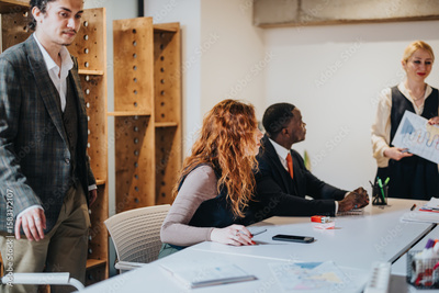 Diverse colleagues engage in teamwork and discussion at a modern office meeting, highlighting professionalism and collaboration in a workplace environment.
