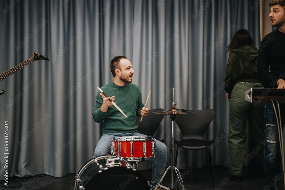 A diverse group of musicians engaging in a lively band practice session. Instruments like drums, guitar, and keyboard are visible, capturing the excitement and creativity of making music together.