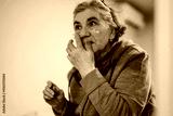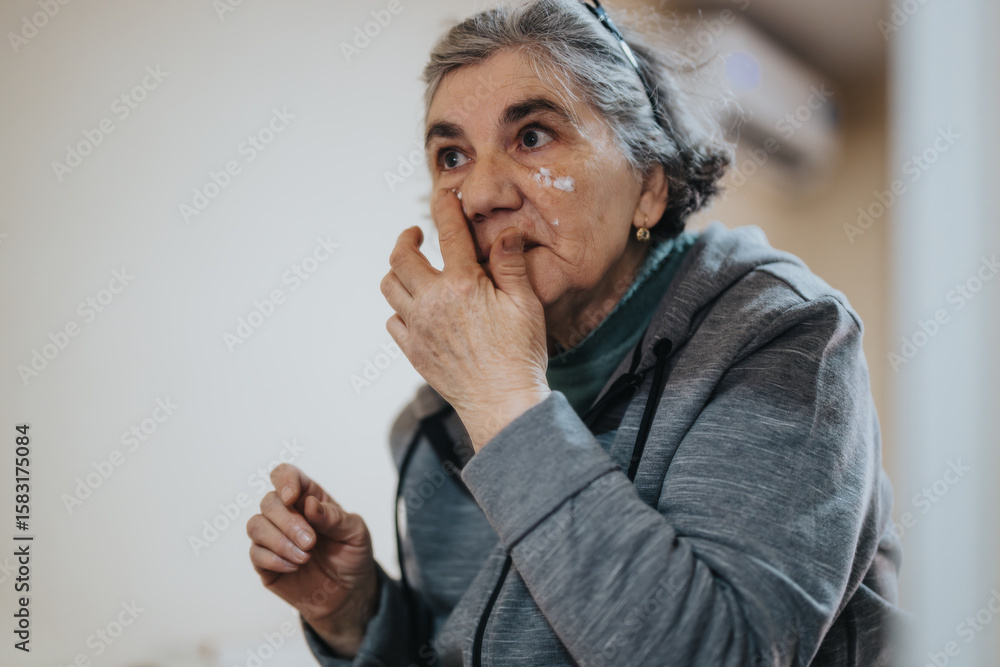 An elderly woman in a gray hoodie touchingly contemplates something while indoors, expressing a sense of thoughtfulness and reflection.
