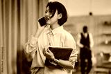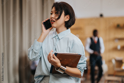 A dynamic workplace moment showing a professional woman engaged by managing business tasks via phone and holding a folder, demonstrating productivity in a collaborative co working space.