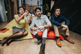 Coworkers enjoying a collaborative gaming session during a break in an office lounge. A fun and supportive environment fostering camaraderie and work-life balance.