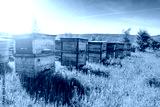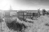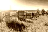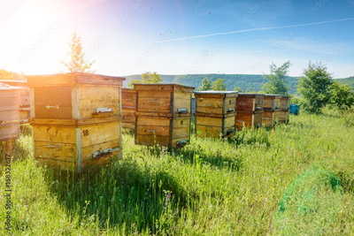 Hives in an apiary with bees flying to the landing boards. Apiculture.