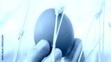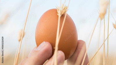Hand holding brown egg in wheat field, symbol of free range farm and natural production