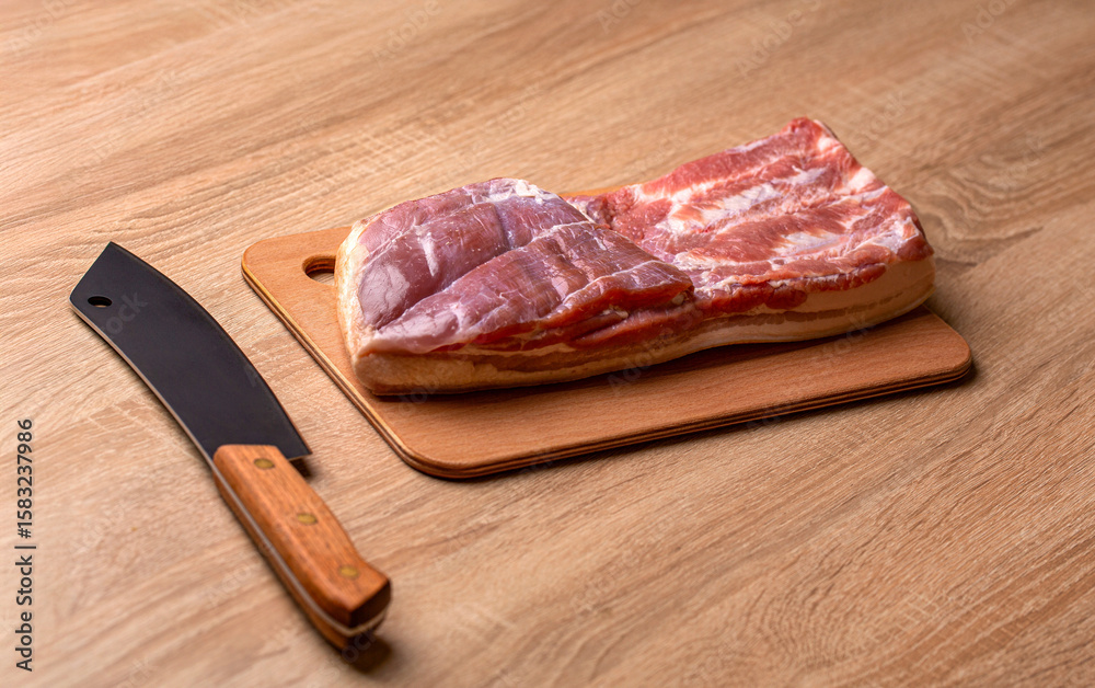 Meat pork fresh. Raw meat on cutting board. Axe and meat pig. Fat piece. Fresh pork meat. Piece of raw lard. Meat raw fresh pork on wooden board, knife, closeup, cutting meats