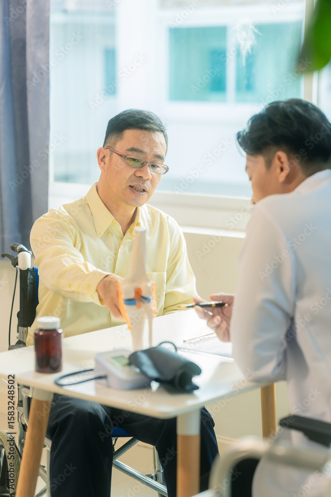 Senior man consults with doctor about joint pain and mobility problems in clinic. Asian male doctor and patient talking in hospital office. Healthcare services.