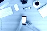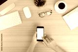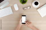 hand use phone mobile white screen on work table top view