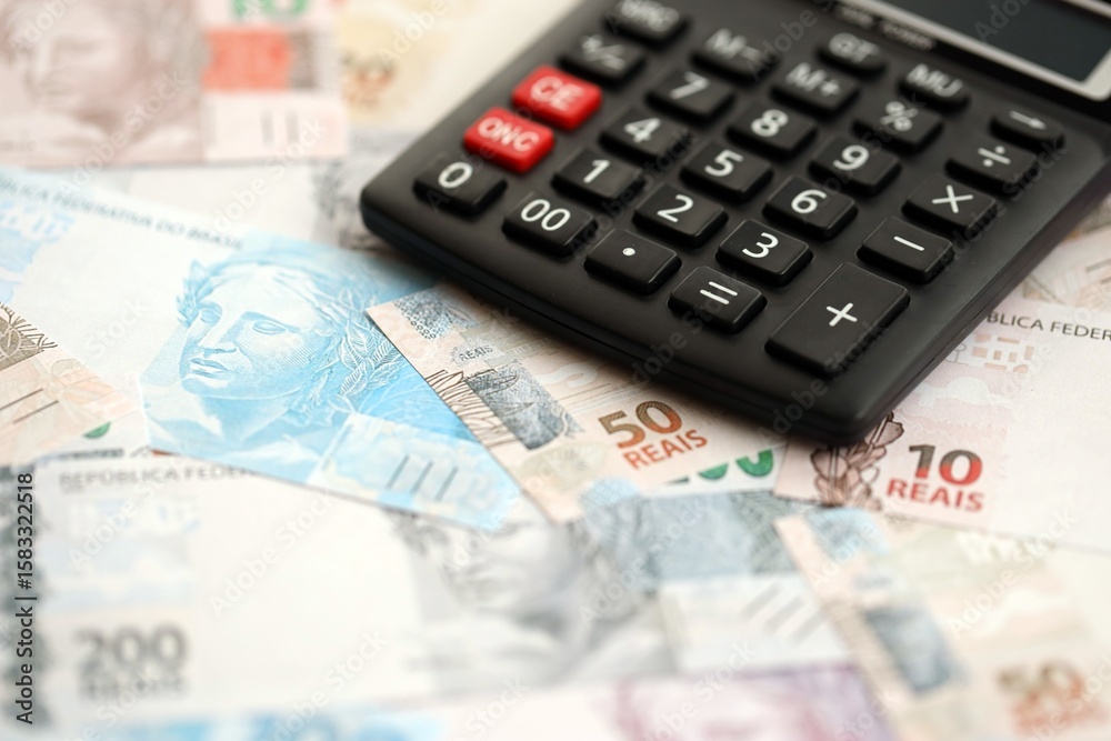 Brazilian reais banknotes and calculator. The current Brazil real money bills and calculator
