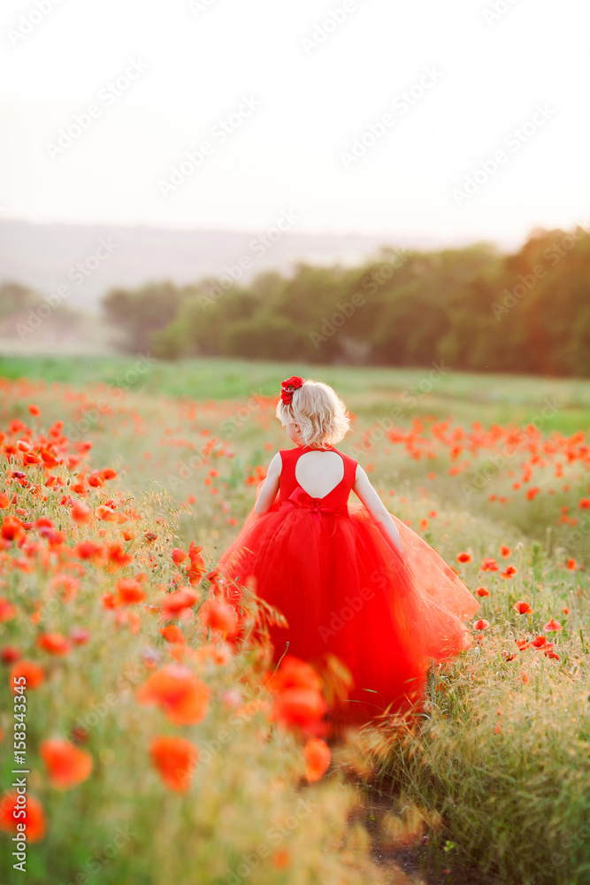 countryside, childhood, holidays, summer concept - small fair-haired fairy in beautiful scarlet poofy dress with tulle skirt rushing through the field of poppies
