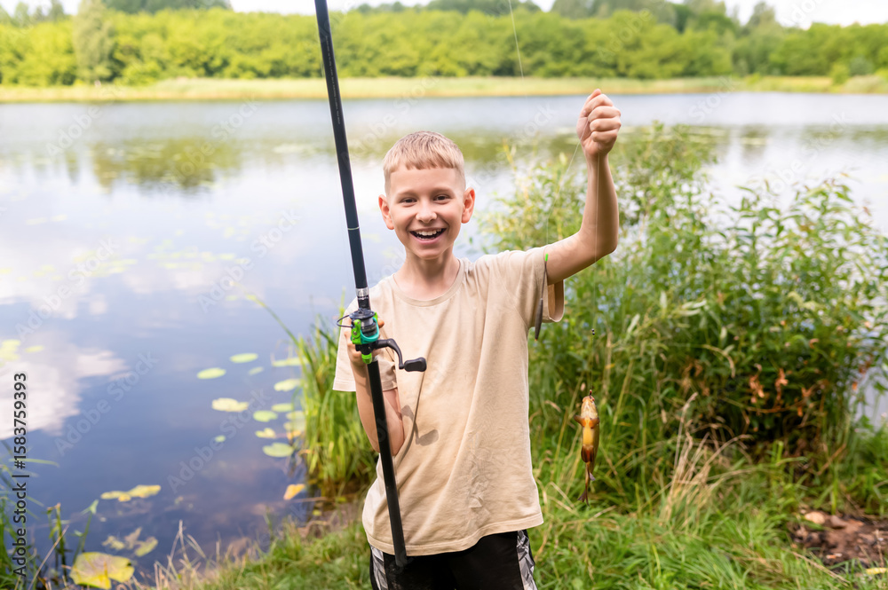 Happy teen boy holding fishing rod with caught fish on lake shore in summer