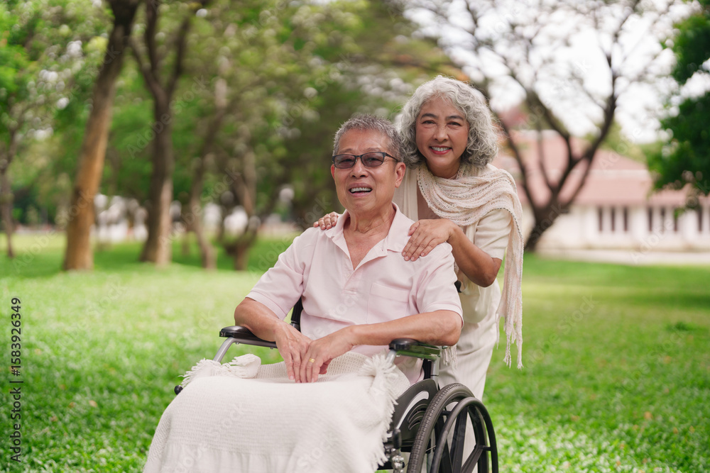 Asian couple park enjoy retirement life woman caring for husband in wheelchair outdoor green space