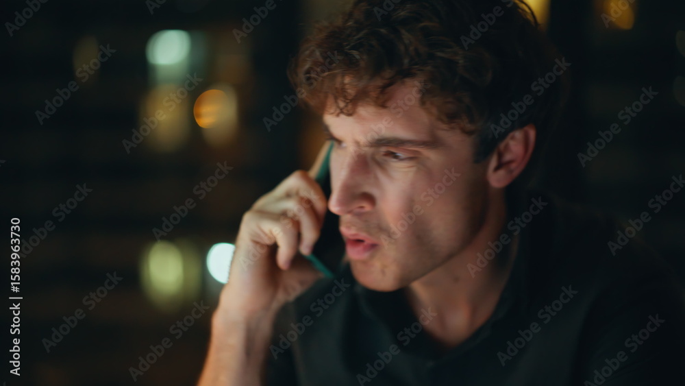 Furious boss complaining cellphone call throwing papers at night office closeup