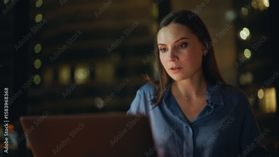 Woman entrepreneur rejoicing success at laptop in dark office working closeup.