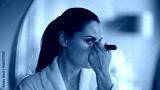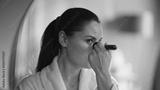 Woman powdering beautiful face looking in bathroom mirror closeup. Relaxed lady