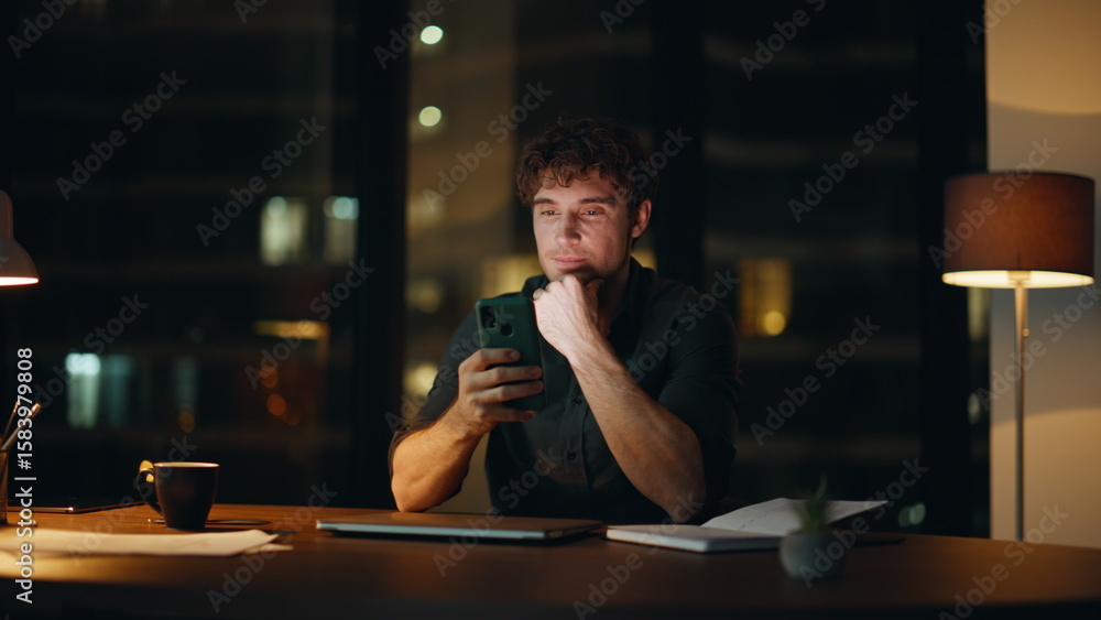 Happy late worker texting cellphone sitting dark workplace with closed laptop.