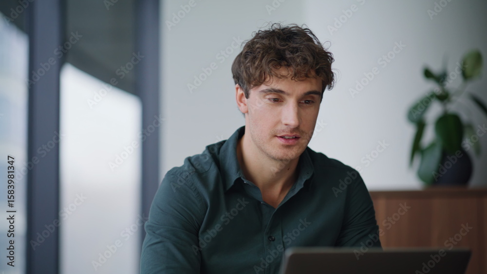 Enthusiastic professional working laptop at corporate office interior closeup.