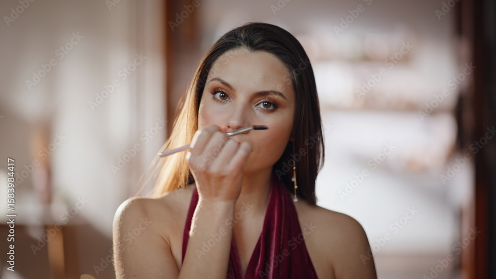 Gorgeous lady applying mascara on eyelashes with brush looking mirror closeup.