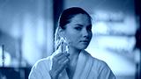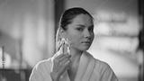 Girl massaging face roller at morning skincare routine closeup. Relaxed woman