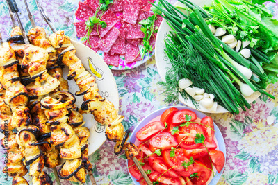 On the table plates with shish kebabs, sausage, greens and vegetables. Picnic. Food on the table
