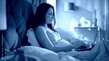 Freelancer typing laptop beddings home bedroom closeup. Relaxed woman writing