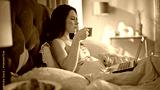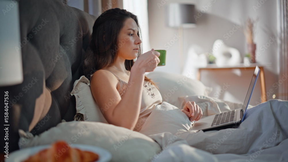 Woman freelancer working bed drinking morning coffee closeup. Beautiful lady