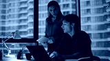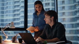 Businesswoman checking manager work at evening workplace closeup. Two colleagues