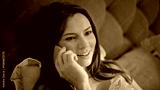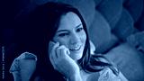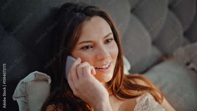 Brunette talking cellphone bed awake early morning closeup. Smiling woman enjoy